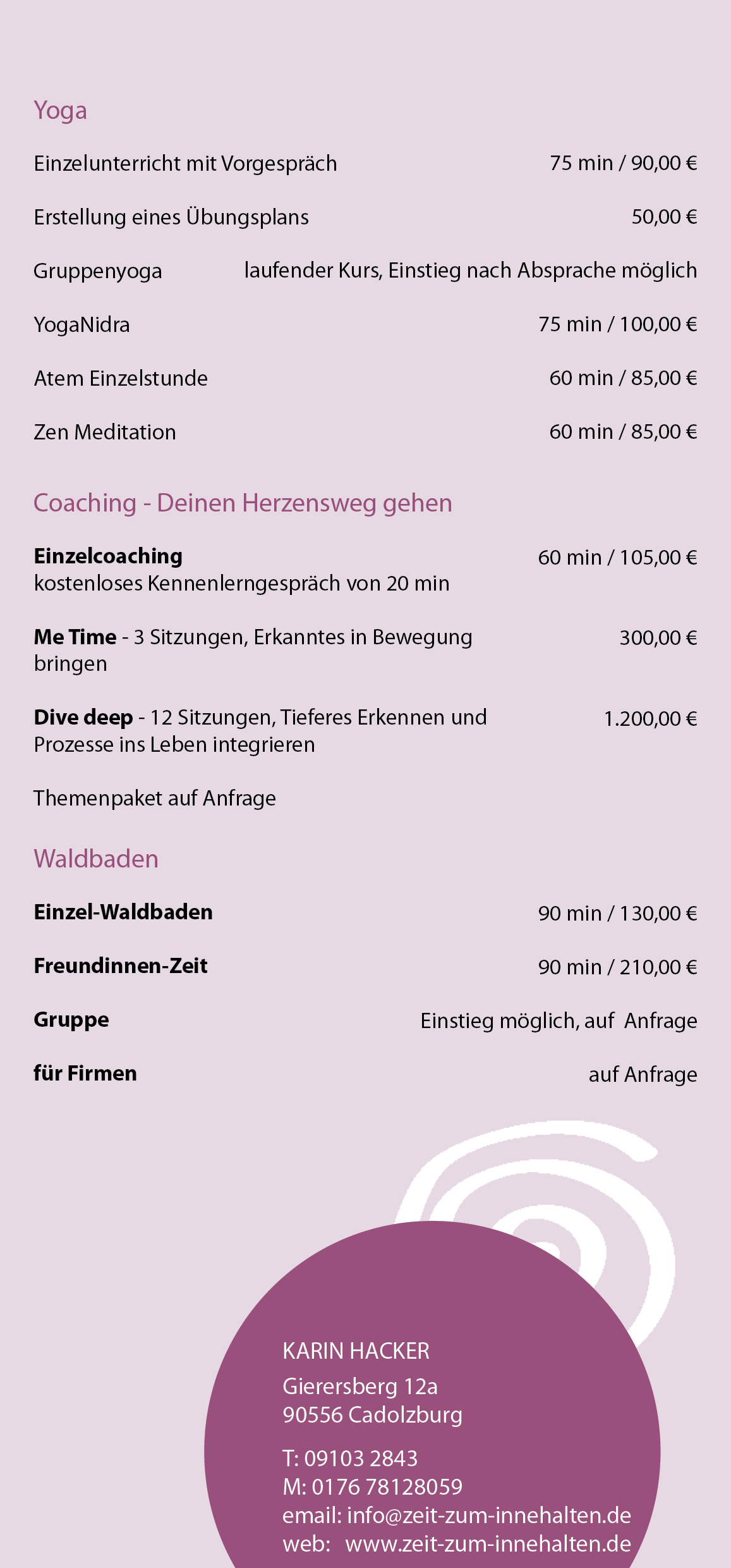 Ich empfehle Ihnen eine Behandlungszeit von 90 bis 120 Minuten. Aus meiner jahrelangen Erfahrung kann ich Ihnen sagen, dass der Prozess des Ankommens, des Loslassens und des Innehaltens seinen ganz eigenen Rhythmus hat und Zeit braucht.